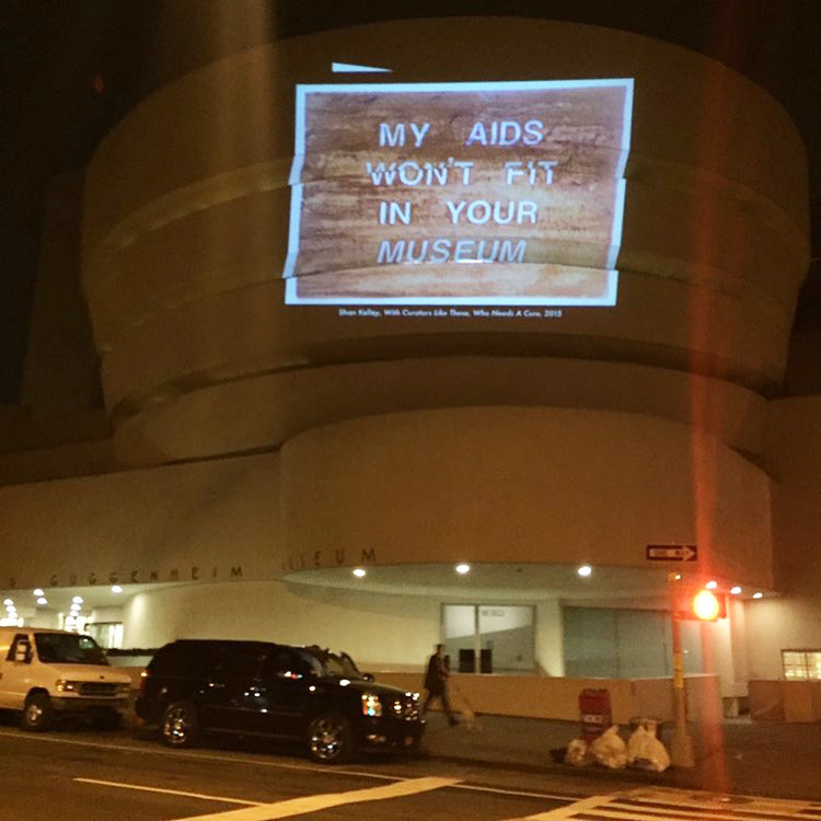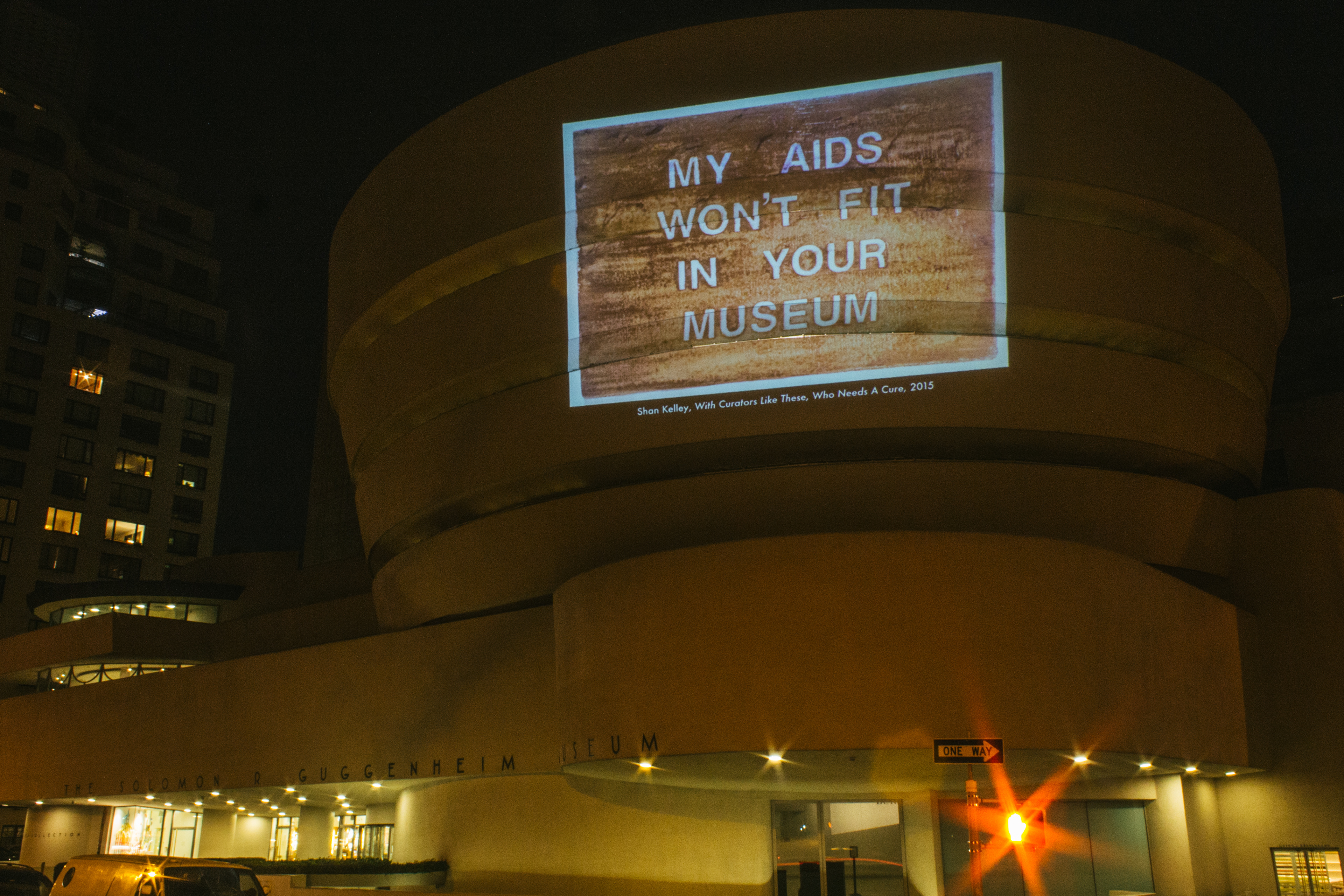 Projection of Radiant Presence by Visual AIDS, on Solomon R. Guggenheim Museum, NYC, for 26th annual Day With(out) Art / World AIDS Day, 2015. Photo credit: Alex Fialho