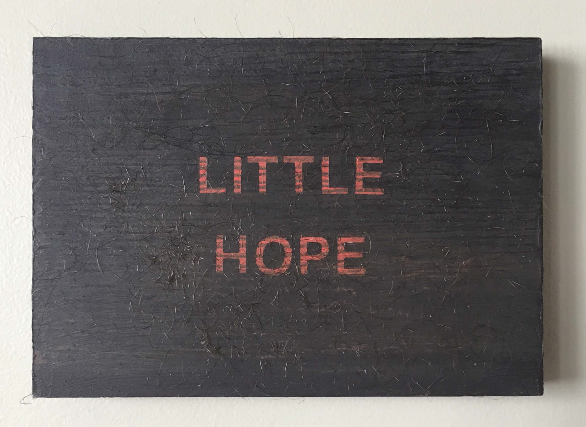 Hope, 2015 - photo transfer, oil paint, semen, pubic hair, resin, on wood, 5" in. x 7" in. x 3/4" in.
