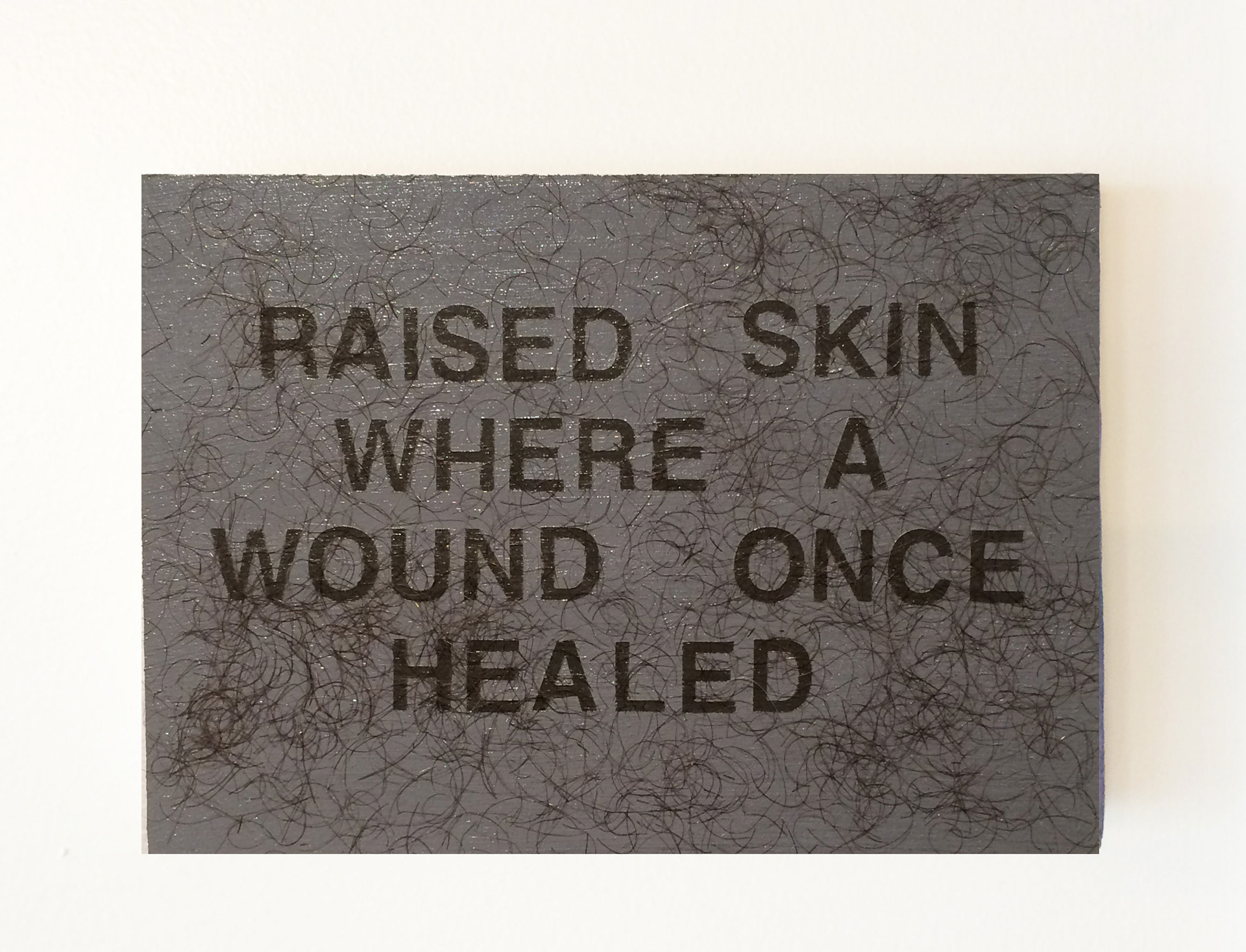 Blood Grief, 2016 - photo transfer, oil paint, semen, pubic hair, resin, on wood, 8" in. x 6" in. x 3/4" in.