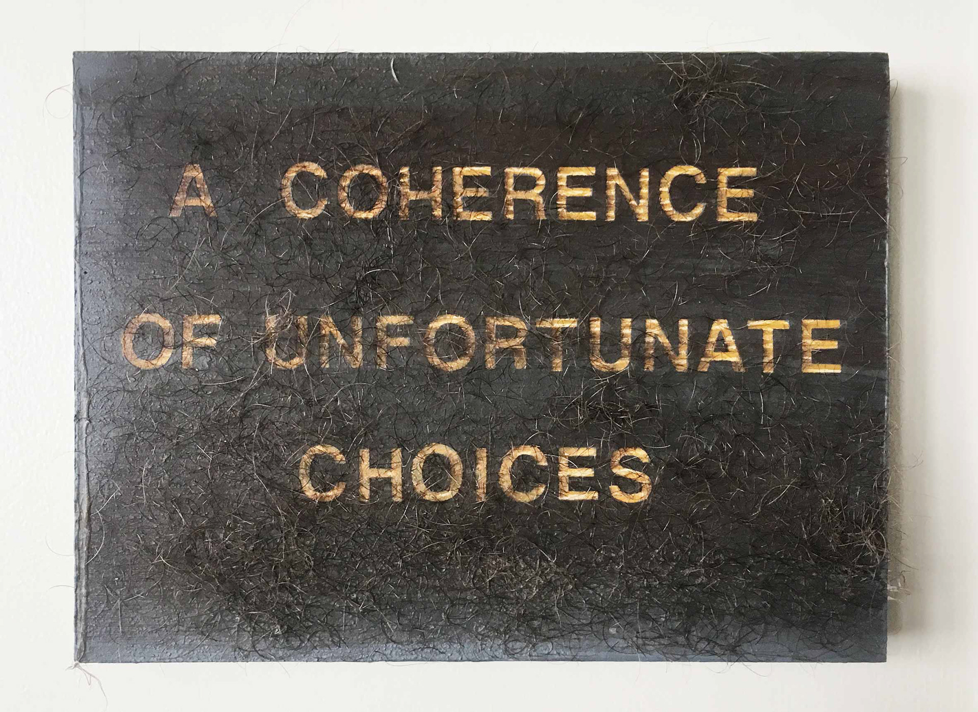 Choices 2016 - photo transfer, oil paint, semen, pubic hair, resin, on wood, 8" in. x 6" in. x 3/4" in.