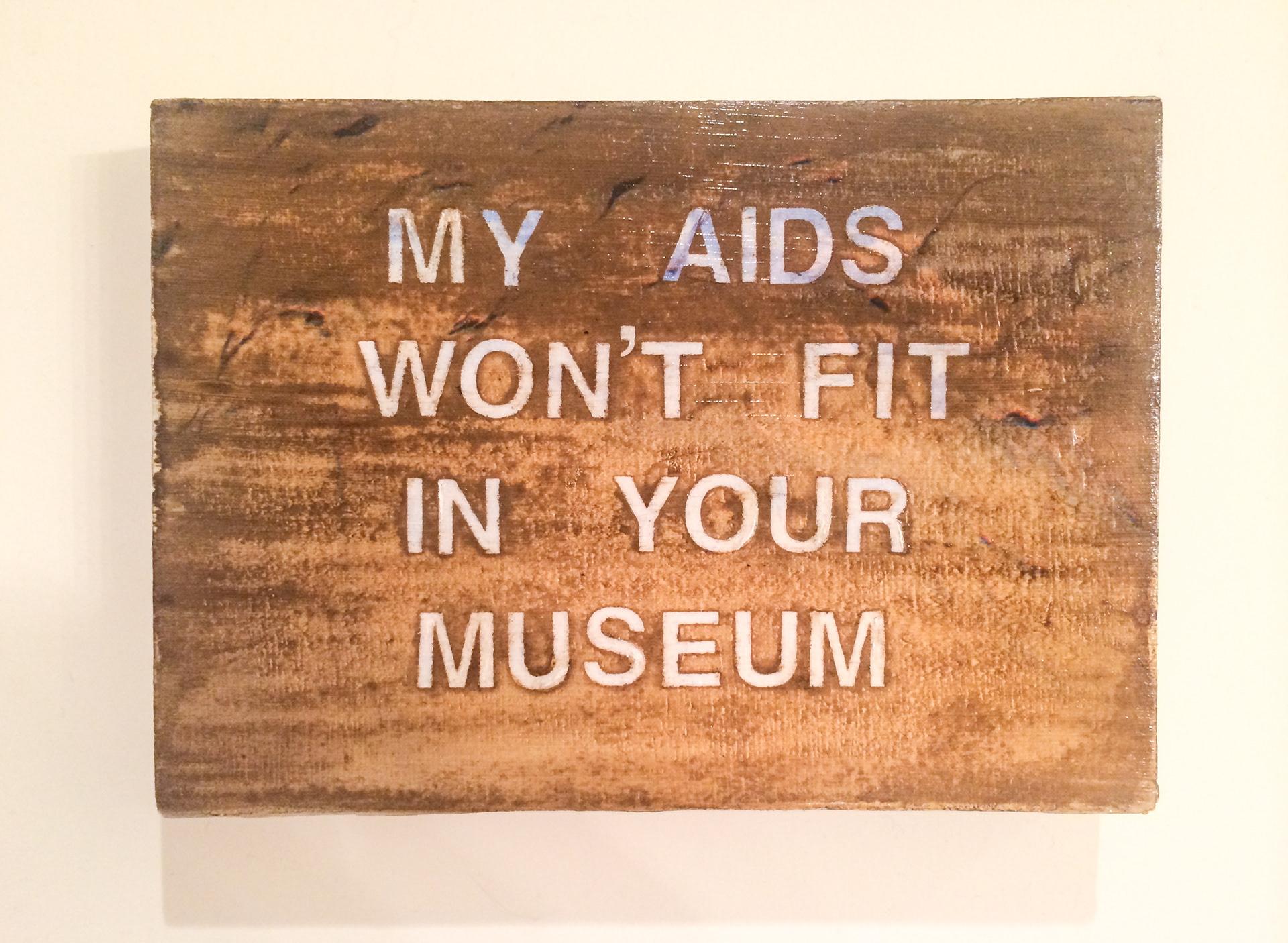 With Curators Like These, Who Needs A Cure, 2015 - photo transfer, oil paint, semen, pubic hair, resin, on wood, 5" in. x 7" in. x 3/4" in.