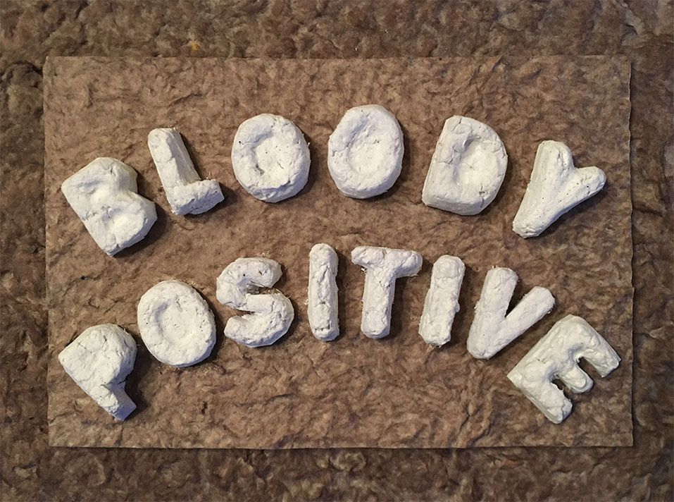 "Still Bloody Positive", Handmade cast paper, blood, epoxy, 5 x 6 in. (pictured), 4 x 6 in. produced in edition of 10, 2016